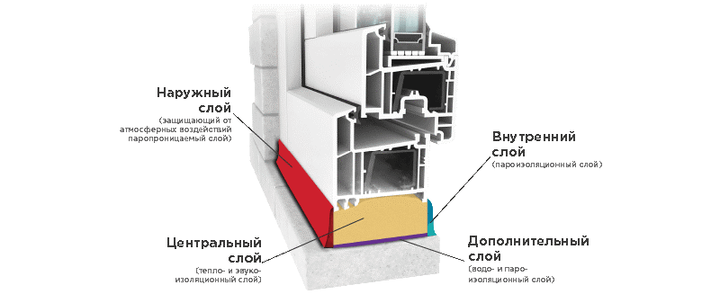 Чтобы пена не утратила этих свойств, её нужно правильно защитить – снаружи от дождя и солнца, а внутри от парообразной влаги. Поэтому перед установкой окон стоит уточнить, как будет устроен монтажный шов.