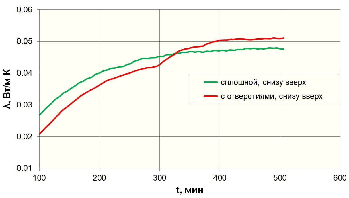 Результаты измерений приведены на рисунках 3 и 4. Истинное значение коэффициента теплопередачи необходимо определять по завершении установления процесса (правая часть графиков). Видно, что при переносе тепла сверху вниз наличие отверстий не повлияло на коэффициент теплопередачи. При переносе тепла снизу вверх коэффициент теплопередачи увеличился для обоих образцов (то есть теплоизоляционные свойства при таком направлении переносе тепла хуже), и оказался на 8% больше для образца с отверстиями. Такая разница получена при том, что объем отверстий составляли лишь 11% объема образца. Повышение коэффициента теплопередачи при наличии отверстий является следствием конвективного переноса тепла в них и подтверждает, что увеличения диаметра пор в материале до 12 мм ухудшило бы его теплоизоляционные свойства.
